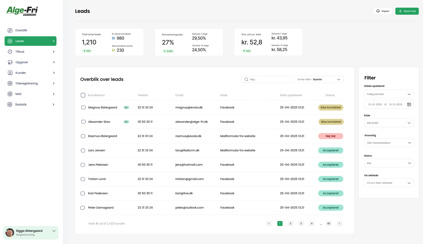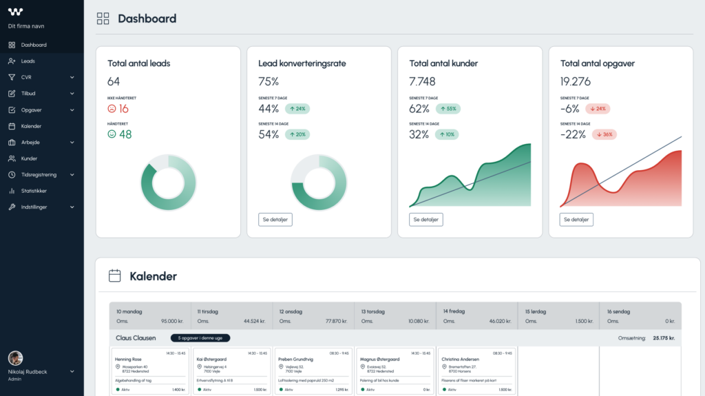 Se konverteringsrater, antal leads, antallet af sendte og accepterede tilbud, afsluttede opgaver, medarbejderperformance og meget mere – alt sammen i overskuelige grafer og rapporter.
